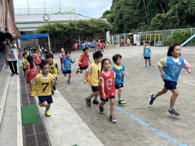 もうすぐ運動会。残念ながら目前に控え、雨が続いています…。そんな中、日々盛り上がりを見せるのは黄組さんのリレー!!この写真は勝負がついた後、思わず興奮冷めやらぬ状態で走り出す黄組さんたちの様子…