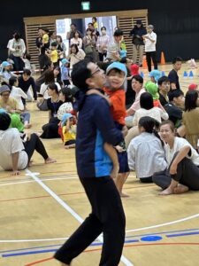 開会前、みんなでリズム遊びの「金魚」で筋肉リラックス、血流もアップ!!