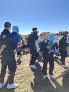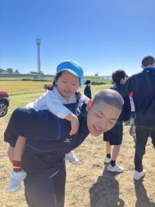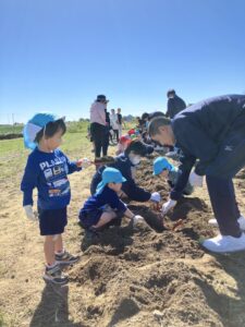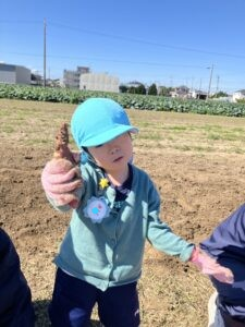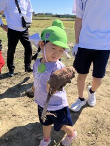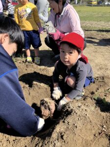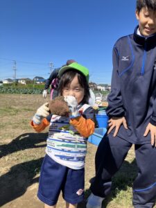 年少・白組さんが同グループ浜松学院興誠中学校の皆さんと一緒にお芋ほりを楽しみました。掘ることを手伝ってもらったり、抱っこにおんぶに・・・とたくさん甘えさせてもらったり、うれしいたのしいお芋ほりとなりました!