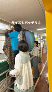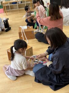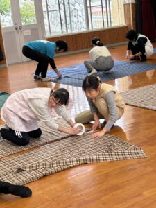 白組は「縄作り」縄跳び用の縄を少し太めの縄を用いて作成…持ち手のところを布で編んでいきます…。