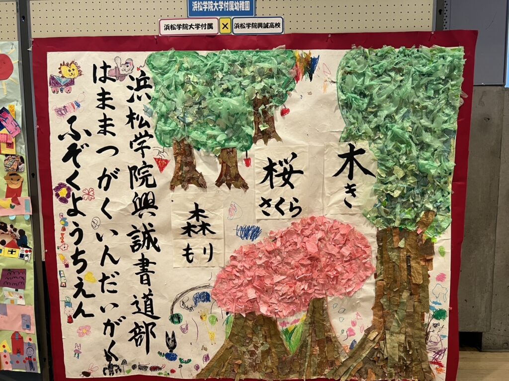 1月24日・25日にクリエイト浜松で開催された冬まつりでは、本校鉄道研究部が手づくりのジオラマを展示しました。また、書道部と浜松学院大学付属幼稚園が一緒に制作した作品も並び、年代をこえて協力して生まれた温かい作品が来場者の皆さまの目を楽しませていました。