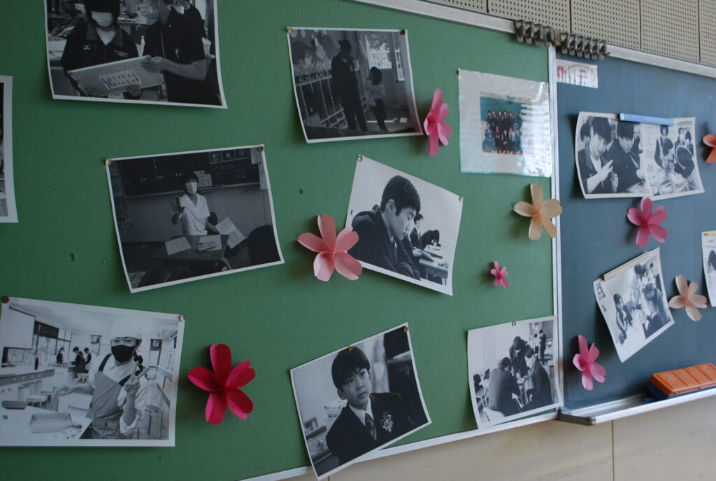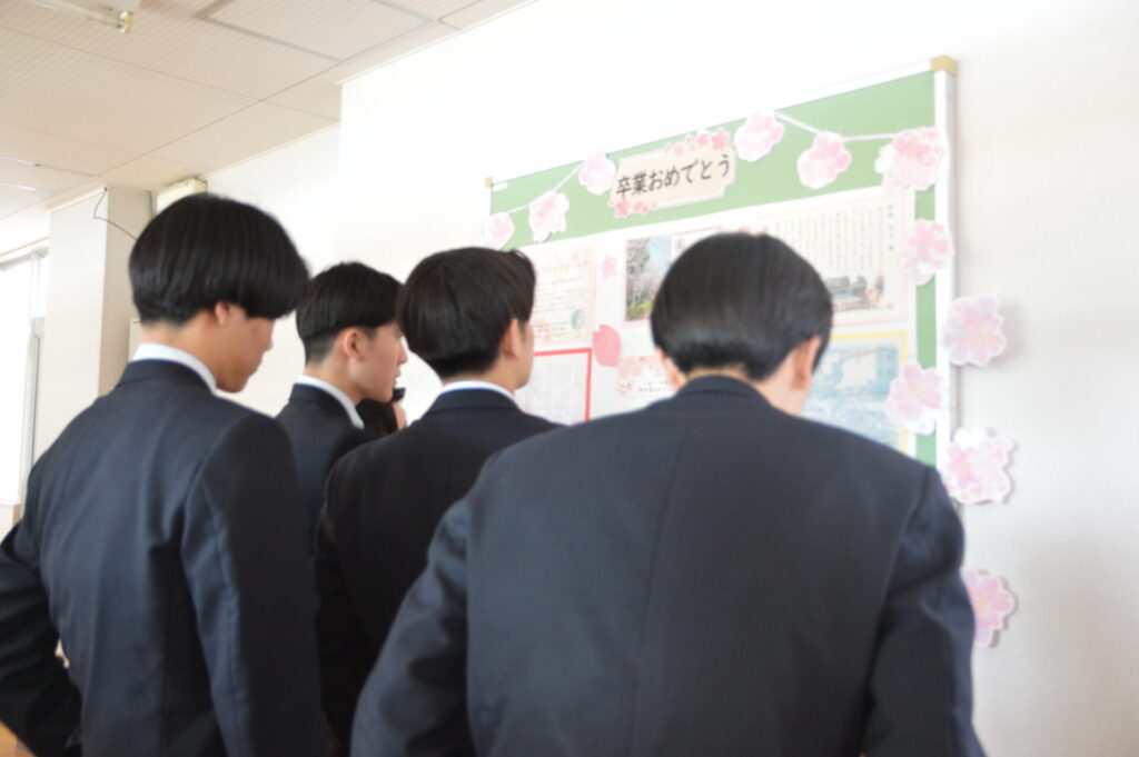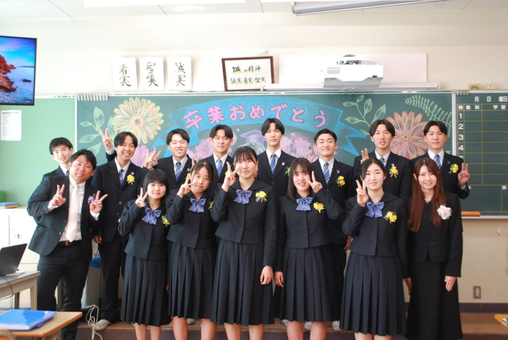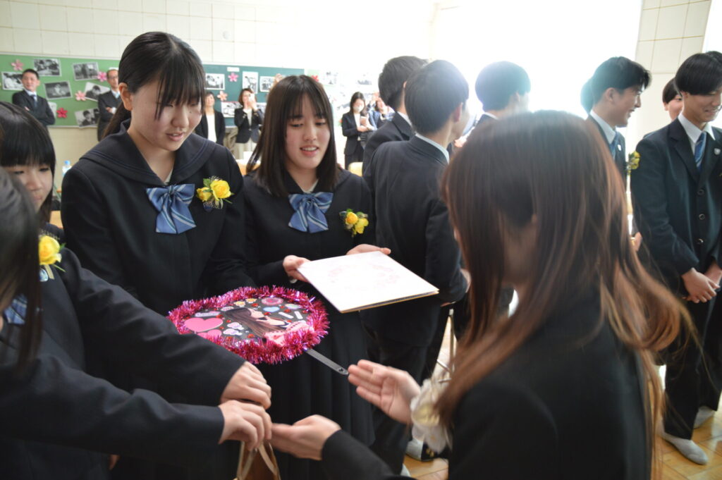教室では、担任からの励ましの言葉や1年間を振り返るエピソードが語られ、生徒たちは静かに耳を傾けていました。黒板にはメッセージやイラストが描かれ、友人や先生と写真を撮り合う姿があちこちで見られ、別れを惜しむ温かな時間となりました。