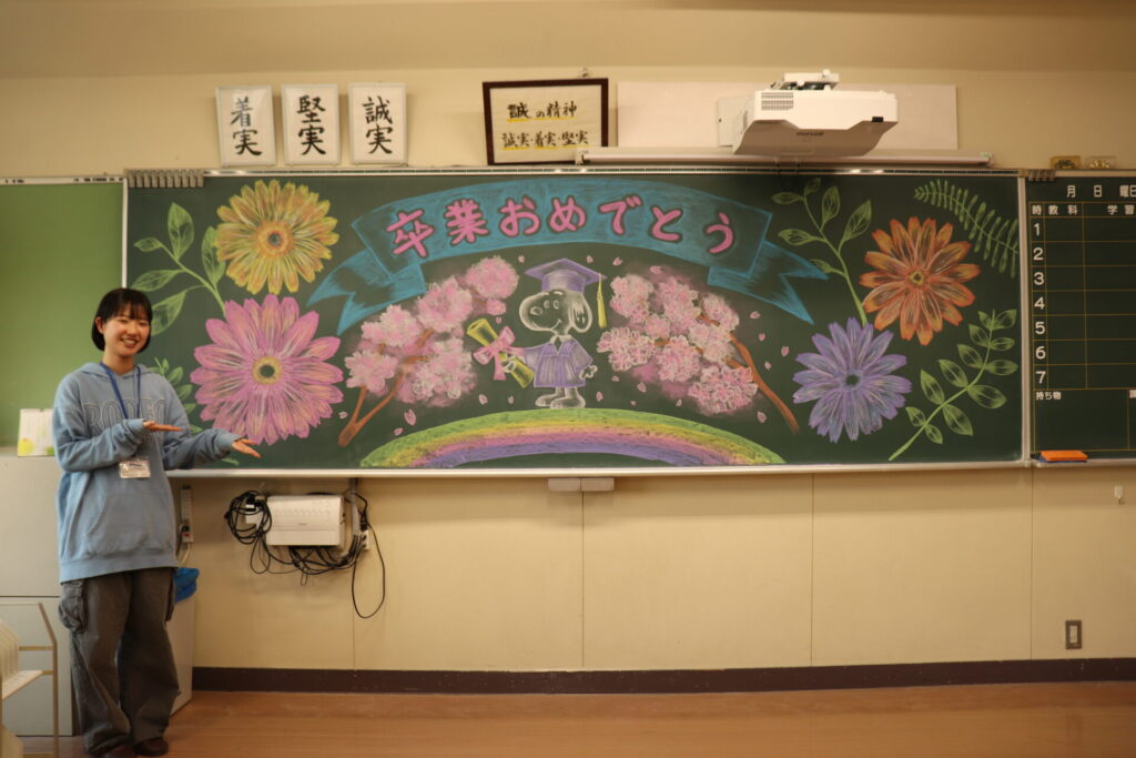 今年も、卒業生を送り出す教室の黒板アートは、浜松学院高校(現:浜松学院興誠高校)の卒業生である木村すももさんに制作していただきました。