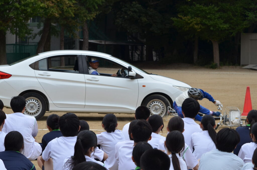 プログラムでは、警察官による講話や事故のケーススタディのほか、各クラスの代表生徒が自転車で走行し、ブレーキをかけ始めた地点からどのくらいの距離で止まることができるかを様々なシチュエーションで体験しました。
