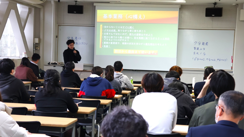 報告会では、クラス毎に各会場で、金融機関・行政施設・サービス業など多岐にわたる現場において体験してきたことを、スライドを用いて発表していきました。