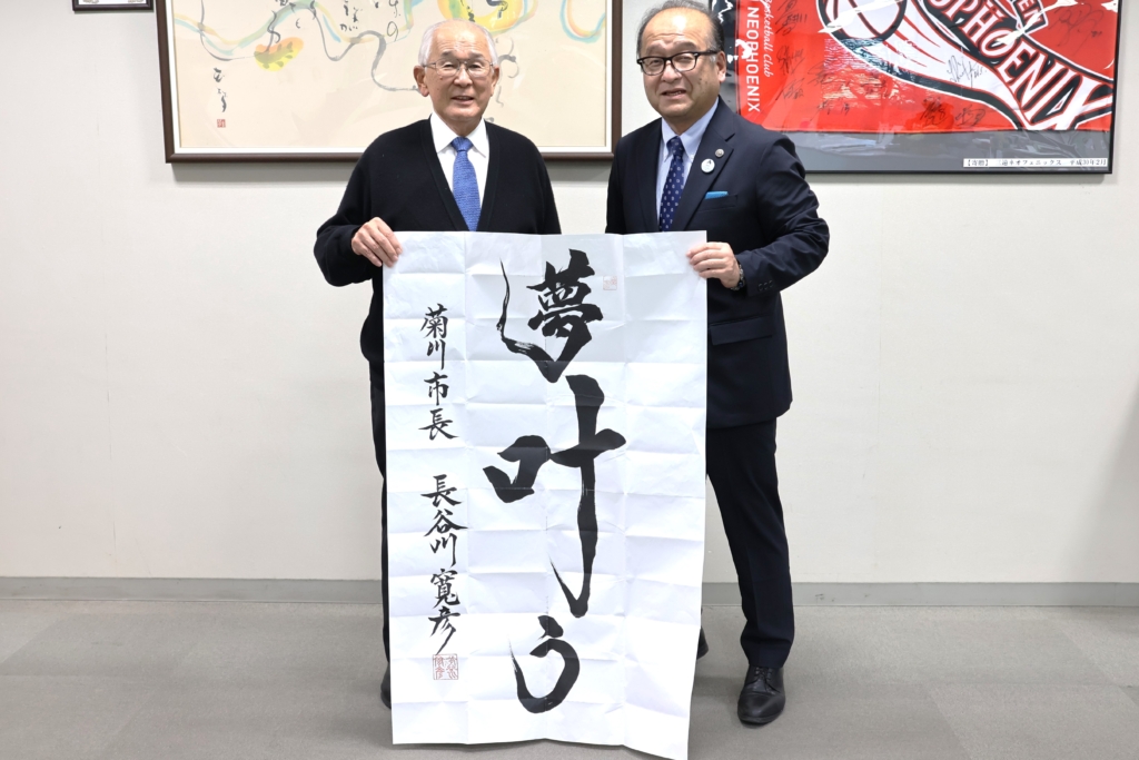 ご持参された書初めとともに映る長谷川市長(右)と本学俵山理事長(左)