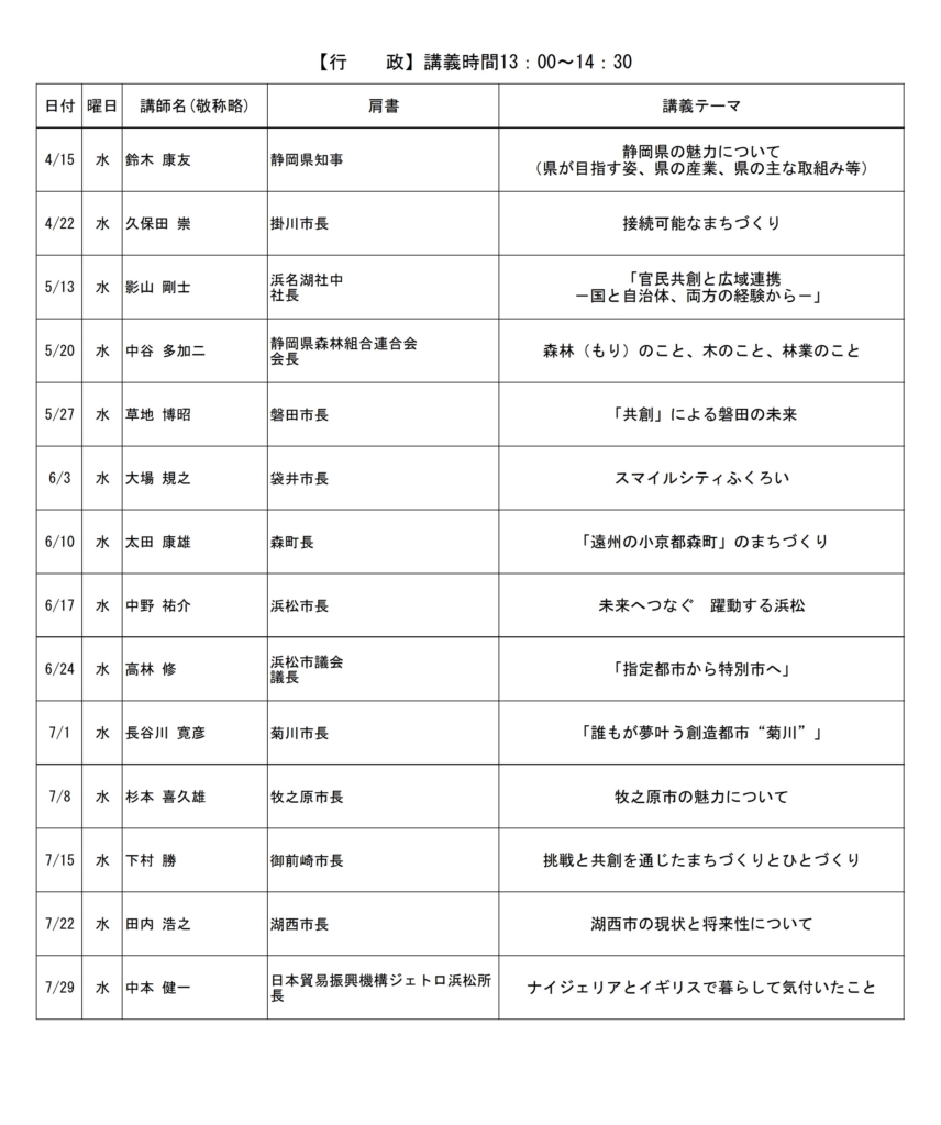 講 座2026.04.13【聴講可能】地域経営学科実践講座のお知らせ ~静岡県知事をはじめとする首長・各界で活躍される方々が講師を務めます!~