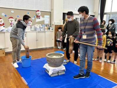 今年ももう、年の瀬…幼稚園でも恒例の「おもちつき」!お父さんやお母さんたち、そしておじいちゃんやおばあちゃんも!みんなにお手伝いしてもらって楽しくておいしい「おもちつき」を行うことができました。感謝申し上げます…「ぼくのお父さんがついてくれたおもち、めっちゃおいしかった!!」(R君が嬉しそうに教えてくれました…)