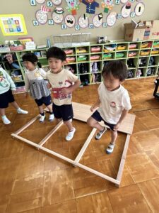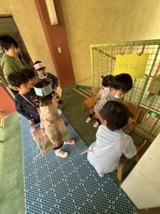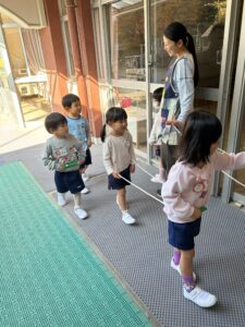 電車ごっこは、今ではカードでピッとやればなんでもできる時代とはいえ、子どもたちのごっこの中では どこまで行きたいか?乗る?降りる?運転手やりたい、切符ちょうだいね…などの意思表示をして「やりとり」を楽しみながら遊びを展開することを大切にしています。