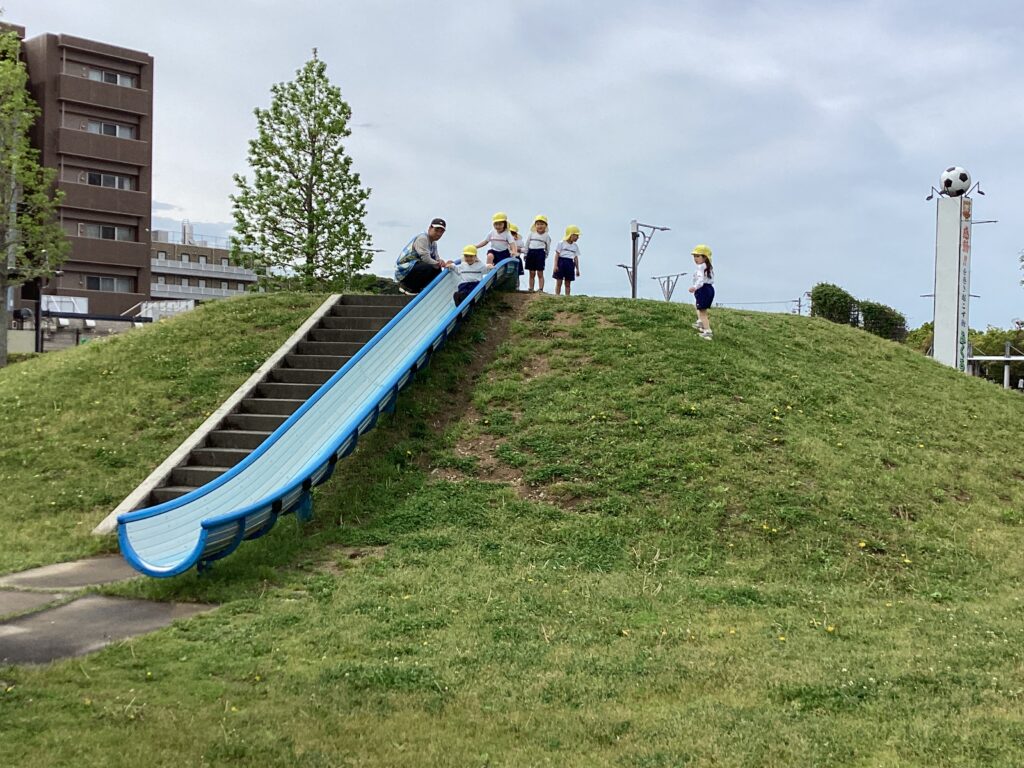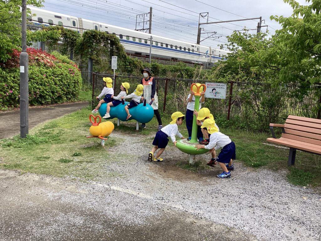 愛野駅前公園にお散歩に行きました。 シロツメクサやタンポポなど春のお花を摘んだり、 春の風を浴びながら体を動かしたりして、思う存分に楽しみました😊 長い滑り台も順番を守って上手に遊ぶことができました。 遊んでいると、新幹線がビューンと!ナイスタイミング🚄 次はいつ通るかな?と、楽しみにしている子どもたちでした。