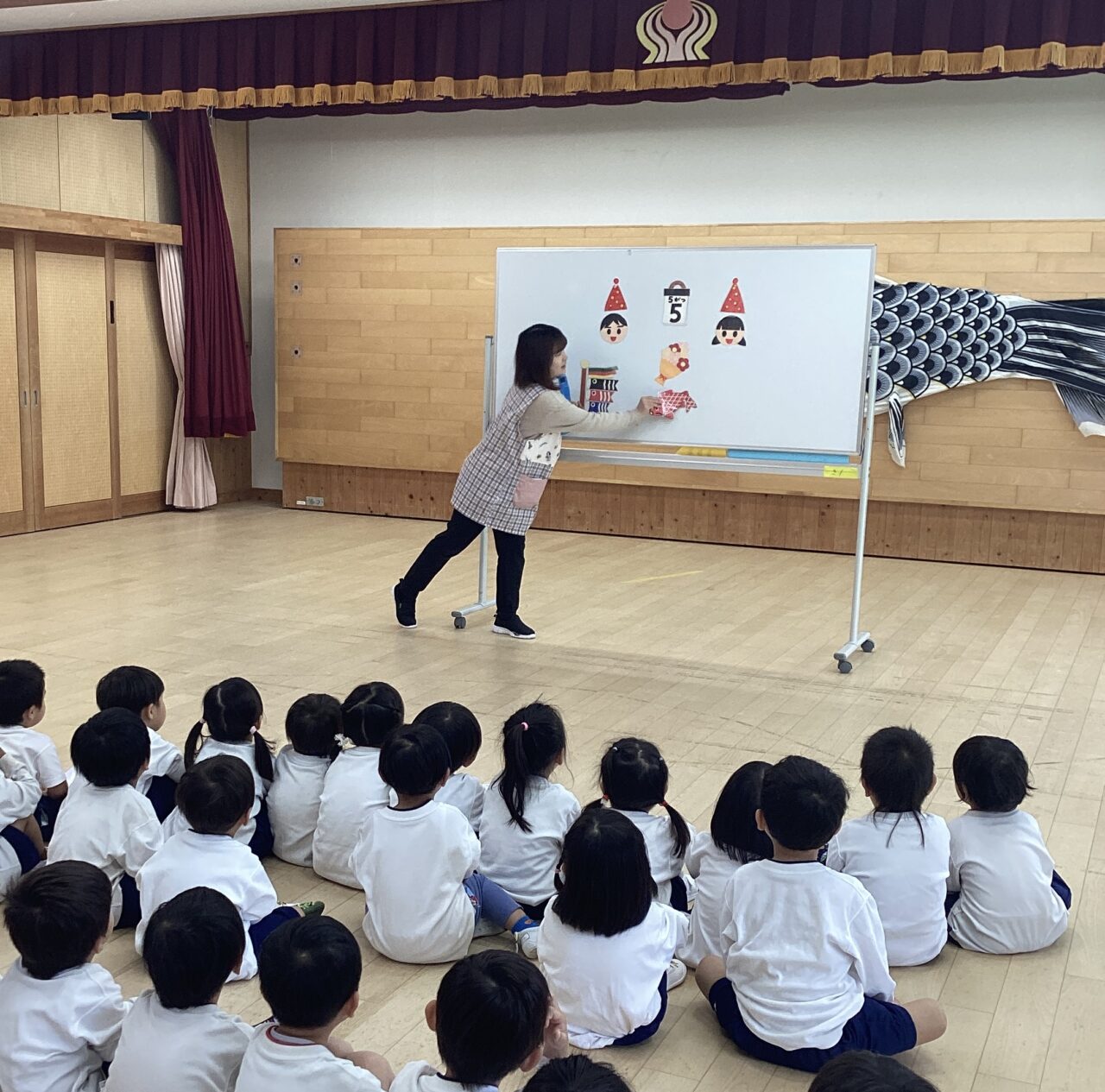 ホワイトボードシアターを見たり、クイズに参加したりして楽しみながらこどもの日に触れていきました。