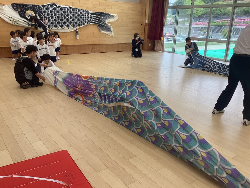 もも組は、鯉のぼりくぐりをしました。初めての行事でしたが、長い鯉のぼりをくぐった先に、大好きな先生がいるのを見てニコニコで楽しんでいました☺️