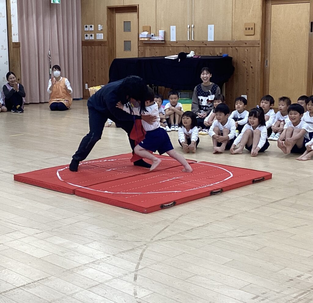 き・あお組は、金太郎と相撲をしました。「はっけよーい、のこった!」の声と共に、大声援に包まれ、見事勝利し、大喜びの子どもたちでした。翌日も相撲ごっこで遊びたいという声が多く、行事限りではなく、その後も楽しんでいました☺️