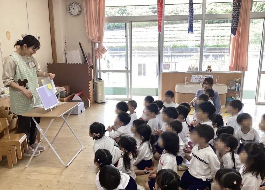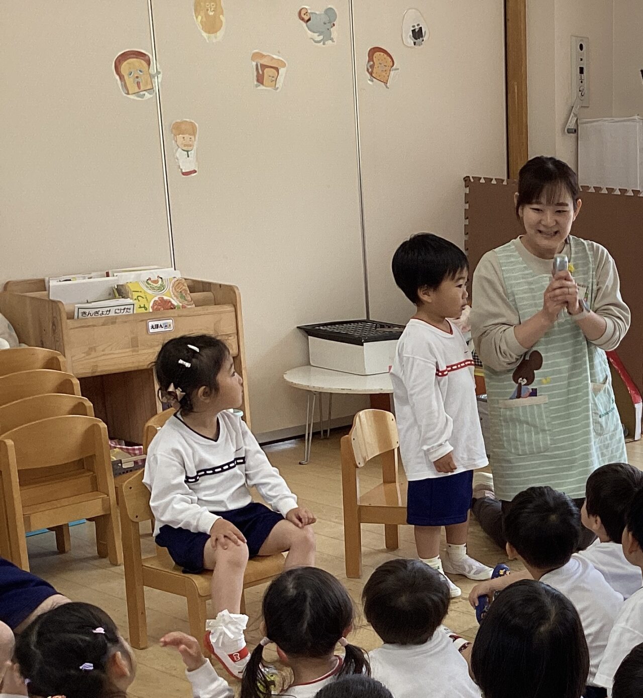 4/22 もも組になって初めての誕生会✨ みんなの前でインタビューがあり、少し緊張しながらも名前や好きな食べ物を答えることができました👏 そのあとはみんなから「happy birthday🎵」の歌でお祝いもしました! お楽しみはゆい先生のパネルシアター🔲 丸や四角、三角などが組み合わさっていろんなものに変身しき、何になるかなと答えながら楽しんでいました。