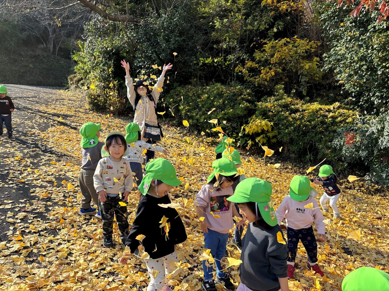 イチョウの葉っぱを集めたり、シャワーのようにしたりして楽しみました。