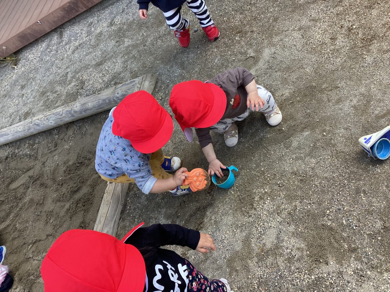 うさぎ組は、お砂場で沢山遊びました‼️先生の真似をして砂を掘ったり、コップに入れたりして少し冷たいお砂の感触を楽しんでいました。靴やズボンが汚れてしまったけれど、元気いっぱい遊んだ証拠❗️ママ、お洗濯お願いしまーす😊